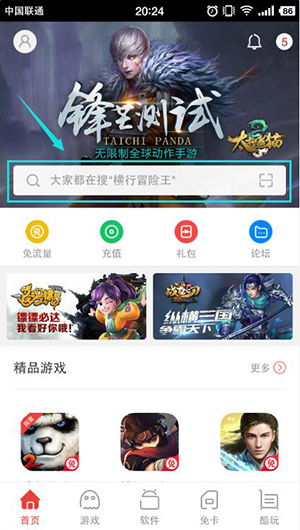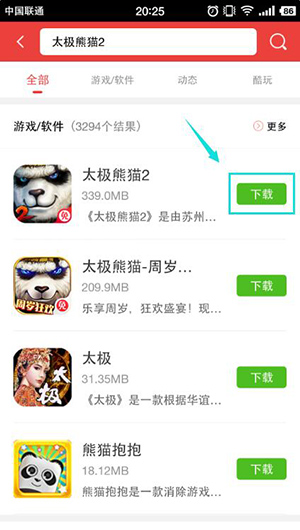 第三步(2):未在主页找到《太极熊猫2》下载按钮的玩家,也可在主页最上方“搜索关键字”处,输入“太极熊猫2”后搜索并点击“下载”。
