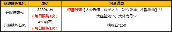 活动期间,游戏商城将推出开服限购礼包,玩家可在商城“限时商品”柜面进行购买!