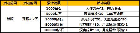 1、活动期间,玩家在游戏内消耗达到一定数量钻石(交易行消费除外),即可在“限时活动”面板领取对应奖励,每档限领一次;