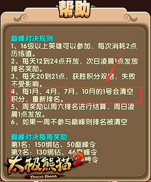 巅峰对决规则第4条规定,每1月、4月、7月、10月的1号会清空积分,重新排名。