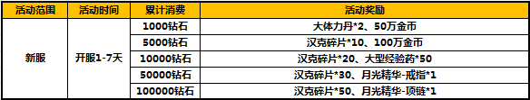 1、活动期间,玩家在游戏内消耗达到一定数量钻石(交易行消费除外),即可在“限时活动”面板领取对应奖励,每档限领一次;