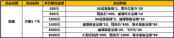 1、活动期间,多日累计充值达到对应金额即可领取对应奖励;
